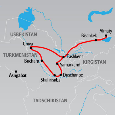 Wie ein modernes Märchen aus 1001 Nacht erhebt sich der aus Marmor und Gold bestehende Traum Aschgabad aus der Wüste. Und hier startet oder endet auch die Turkmenistan Zugreise mit den Sonderzügen wie dem „Orient Silk Road Express“ oder dem luxuriösen „Golden Eagle“, welche Turkmenistan mit Besuchen in anderen Ländern verbindet. Geniessen Sie die stilvollste Art zu reisen und lassen Sie die meist kargen Landschaften von Turkmenistan am Fenster vorbeiziehen. Sie übernachten während Ihrer Turkmenistan Zugreise in bequemen Abteilen und dinieren im Speisewagen Ihres Zuges. Gerne beraten wir Sie über die verschiedenen Möglichkeiten einer Bahnreise, welche Turkmenistan beinhaltet.